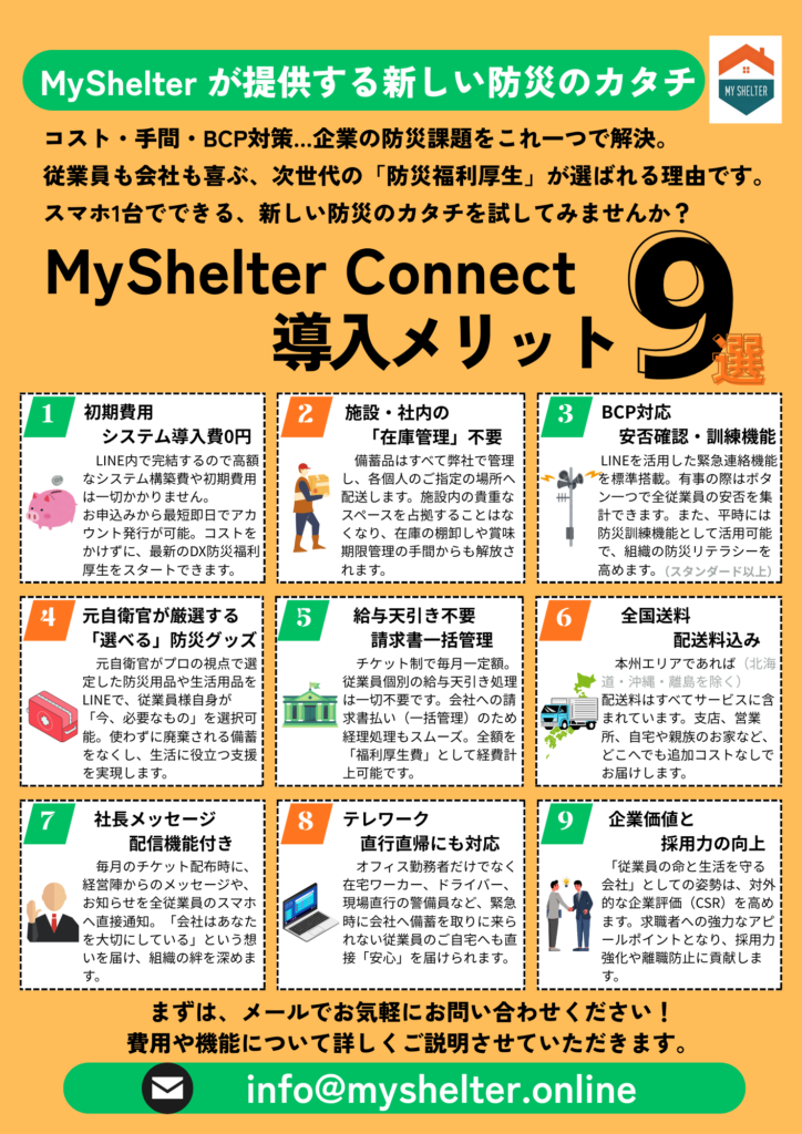 公的支援の限界を、「企業の防災力」で突破する。 従来のオフィス備蓄では対応できない「帰宅困難・在宅避難」に特化した、配送型の福利厚生サービスです。企業と従業員を強固な「備え」で連携させることで、BCP(事業継続計画)の実効性を高め、地域社会の基盤となる企業の存続を支援します。