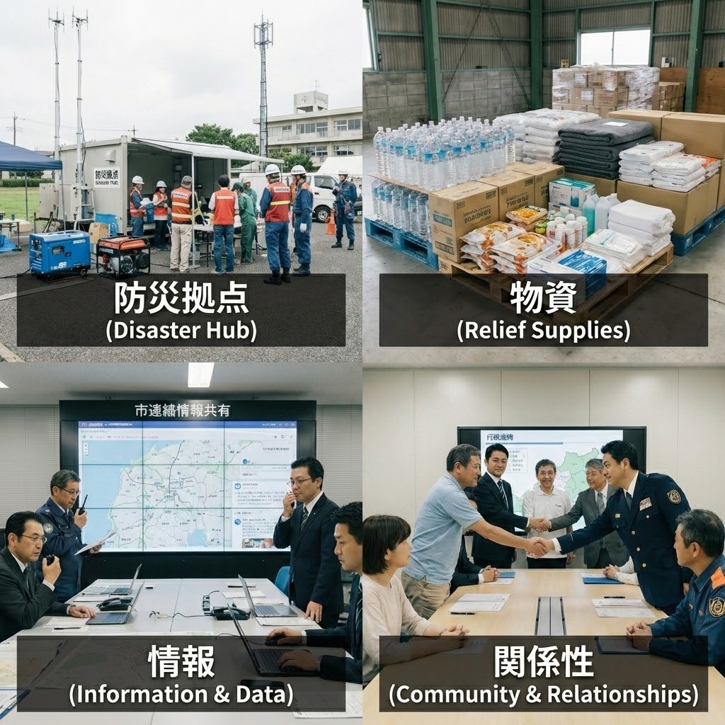 関係性・物資・情報・拠点がつながることで、災害時に機能する現実的な支援導線をつくります。