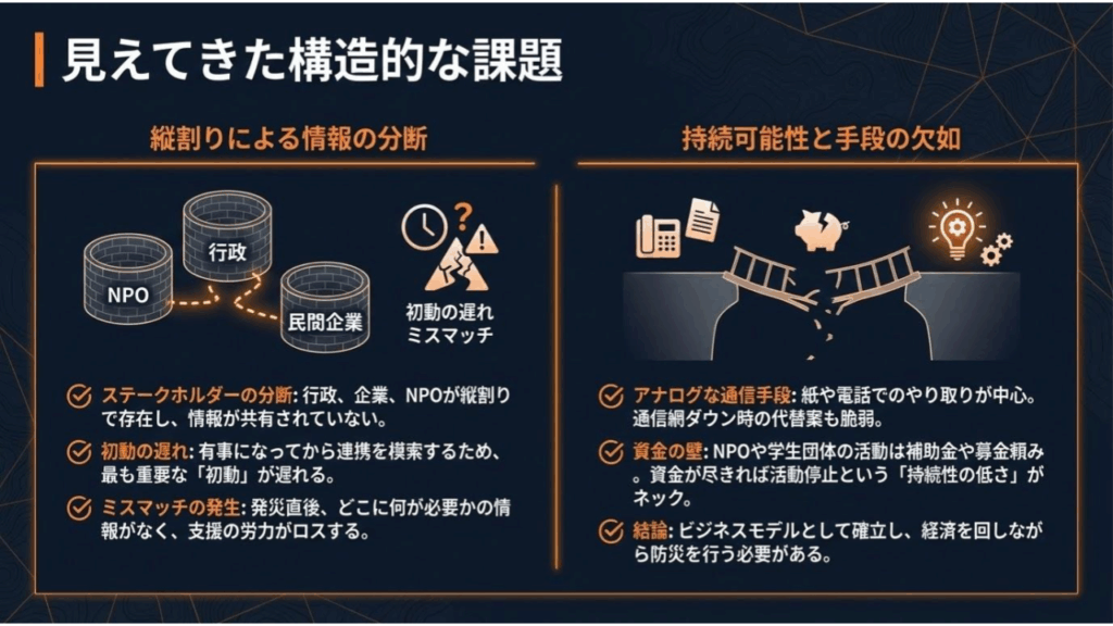 - 支援物資はあるのに、どこに届ければいいか分からない情報の断絶。