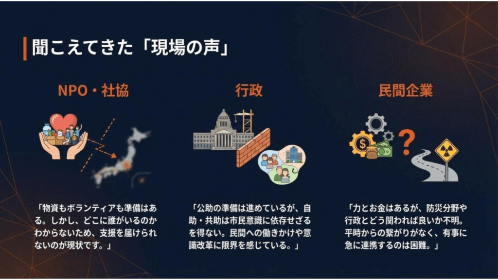 行政、NPO、民間企業。それぞれが懸命に動いているにもかかわらず、構造的な「縦割り」が支援の初動を遅らせています。 このままでは、次の災害でまた同じ悲劇が繰り返されてしまいます。