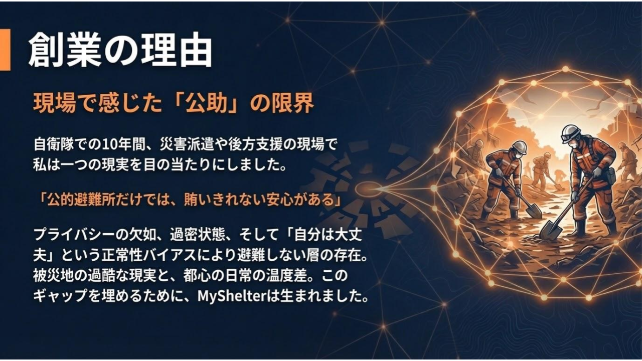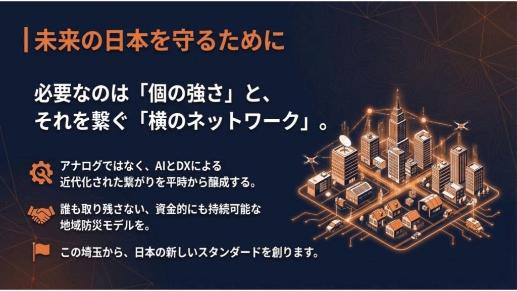- 民間企業・技術者の皆様: 物流、通信、AI解析など、御社の技術を防災インフラへ実装させてください。