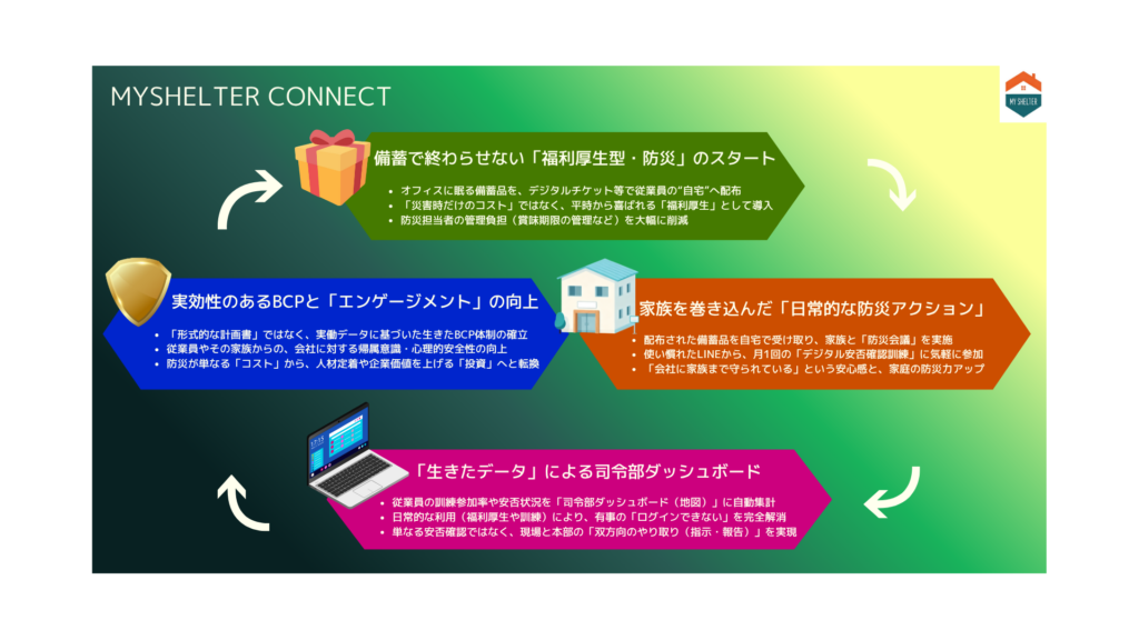 MyShelter Connectは、BCPの実効性を高めながら、福利厚生としても価値を持つ“新しい備え”を企業に提供します。