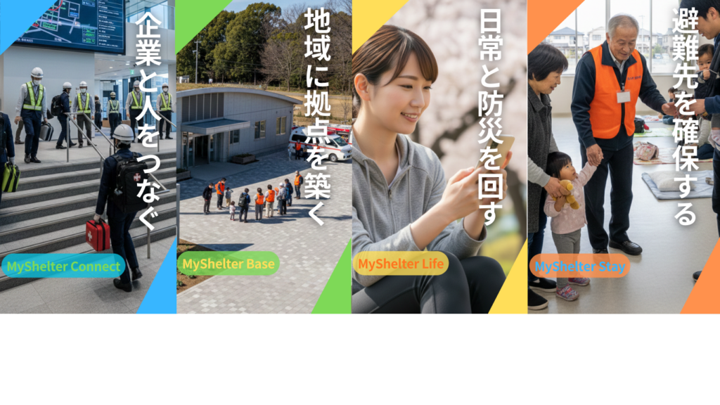 その想いから、私は「Myshelter」という答えに辿り着きました。 Myshelterは4つの柱で展開しています。「つなぐ」「築く」「まわす」「確保する」です。